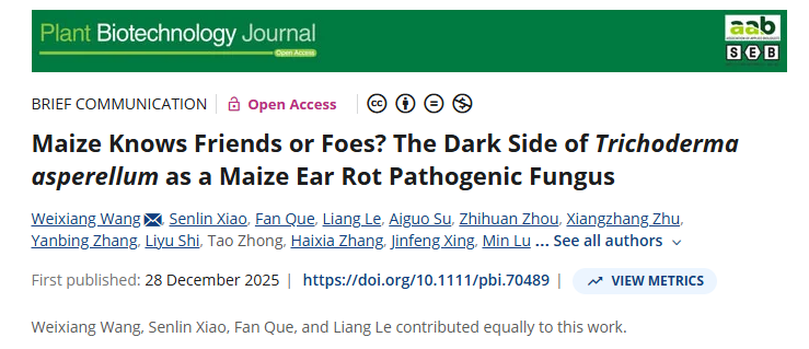 近日,学校王维香教授团队在国际知名学术期刊Plant Biotechnology Journal在线发表了题为“Maize Knows Friends or Foes? The Dark Side ofTrichoderma asperellumas a Maize Ear Rot Pathogenic Fungus”(玉米能辨识敌友吗?棘孢木霉作为玉米穗腐病致病真菌的暗面)的研究论文。该研究首次发现并证实棘孢木霉(T. asperellum)是引发玉米青绿色穗腐病的新型致病真菌,这一突破性发现为生防菌菌剂的应用敲响了警钟,也为全球玉米产业的健康发展提供了关键理论支撑。