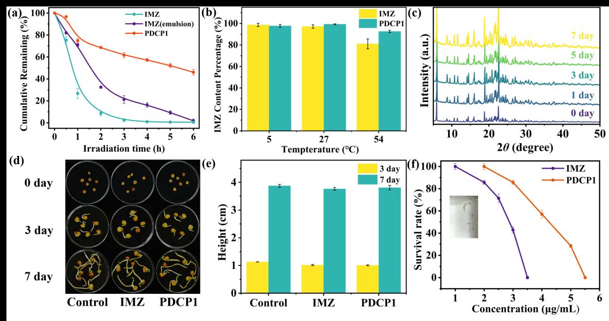 图3. (a) 抑霉唑乳剂、抑霉唑溶液和 PDCP1 悬浮液的紫外线稳定性; (b) 固体抑霉唑和 PDCP1 在不同温度(5、27和54℃)下的热储存稳定性; (c) PDCP1 悬浮液的水稳定性测试; (d)大豆种子萌发实验和(e)幼苗高度实验; (f)以斑马鱼毒性测试。