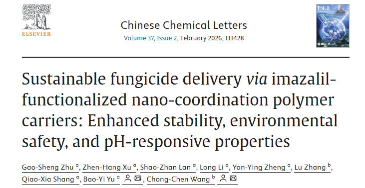 近日,北京农学院生物与资源环境学院农药创制与应用团队在国际知名学术期刊Chinese Chemical Letters发表题为Sustainable fungicide delivery via imazalil-functionalized nano-coordination polymer carriers: Enhanced stability, environmental safety, and pH-responsive properties的研究论文,成功构筑了咪唑功能化纳米配位聚合物载体PDCP1,实现了杀菌剂的高效负载69%与pH响应性缓释。该材料显著提升了咪唑的紫外稳定性、存储稳定性和叶面附着性,对多种病原真菌展现出超高效抑制活性,同时降低了对非靶标生物的毒性。