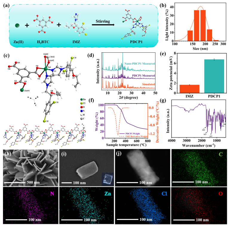 图1. (a) PDCP1合成; (b) DLS分析; (c) PDCP1的配位环境及链结构; (d)模拟和实验PXRD谱; (e)zeta电位; (f) TGA和IMZ DTG谱; (g) FT-IR; (h,i) SEM; (j) TEM图,碳、氮、锌、氯和氧EDS mapping。