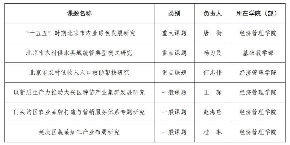 近日,北京市农村经济研究中心公布了北京市乡村振兴专家咨询委员会2026年课题立项名单。学校共获批6项课题,其中重大课题1项、重点课题2项、一般课题3项,立项数量位居前列。